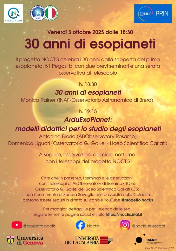 Il progetto NOCTIS celebra i 30 anni della scoperta del primo esopianeta, 51 Pegasi b, con due brevi seminari e una serata osservativa al telescopio.